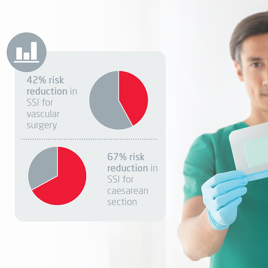 The clinical evidence considered by NICE suggests that Leukomed Sorbact can reduce SSI risk in patients post caesarean section by up to 67% versus standard of care6,7, and by up to 42% in patients post vascular surgery.8,9